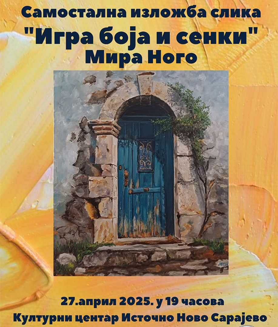 ИСТОЧНО НОВО САРАЈЕВО – Културни центар Источно Ново Сарајево у недјељу, 27. априла, организује самосталну изложбу слика Мире Ного „Игра боја и сјенки“.