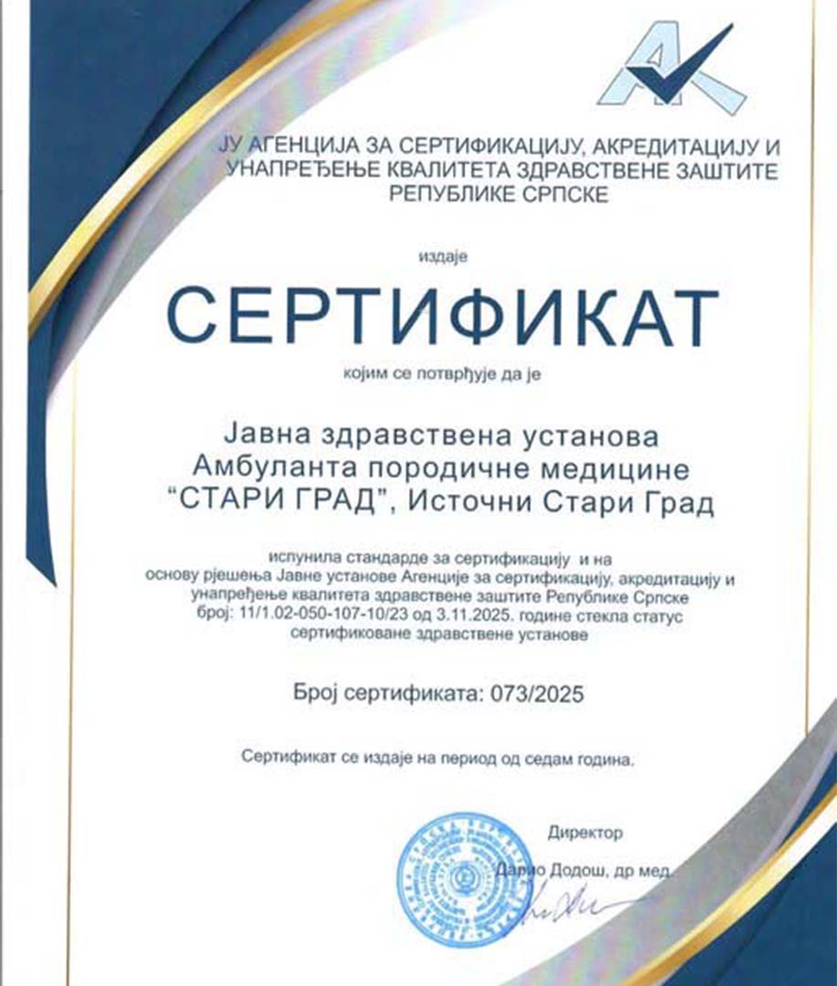ИСТОЧНИ СТАРИ ГРАД – Амбуланти породичне медицине „Стари Град“ у Источном Старом Граду додијељен је сертификат, чиме је званично потврђен висок ниво квалитета здравствених услуга, стручности особља и сигурности за све пацијенте.