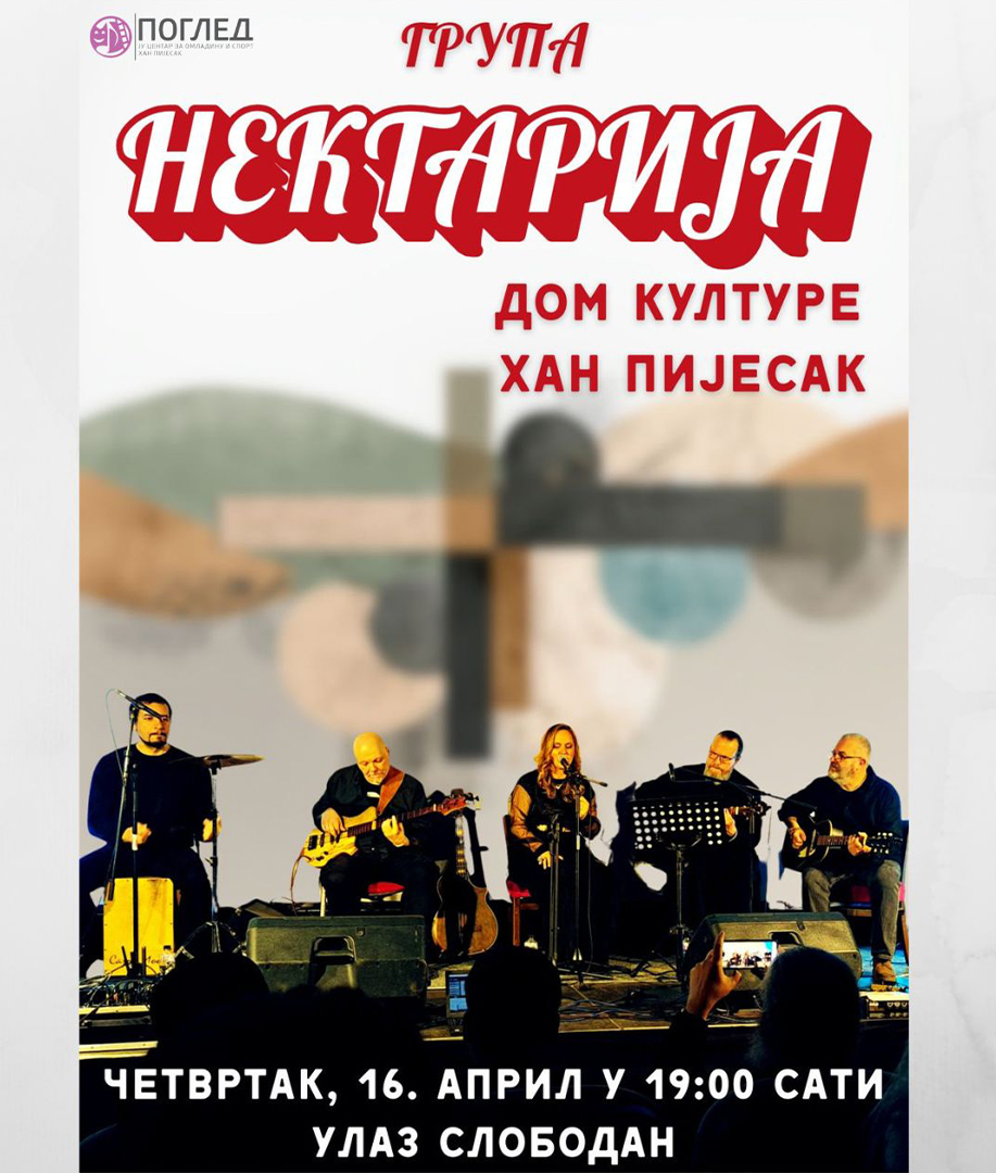 У четвртак, 16. априла са почетком у 19.00 часова, биће одржан концерт групе „Нектарија“. Ријеч је о музичком саставу из Ваљева који изводи ауторску духовну музику. Групу чине Дајана Петровић, вокал и аутор пјесама, јереј Никола Петровић, вокал и гитара, те музичари Миле Јелић, Саша Стефановић и Бранко Поповић. Улаз на концерт је слободан.