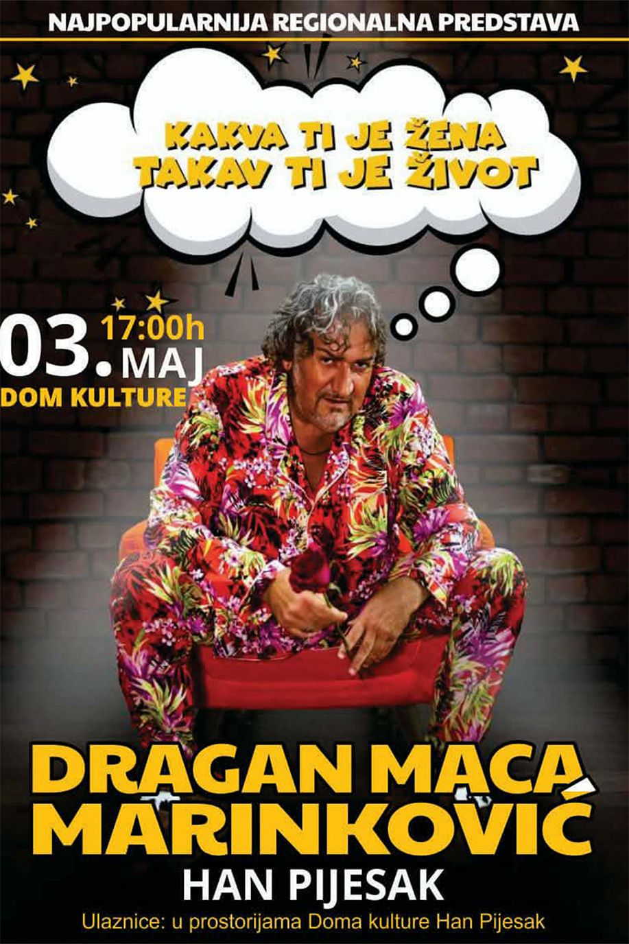 За љубитеље хумора, у недјељу, 3. маја у 17.00 часова, биће изведена хит представа Драгана Маринковића Маце „Каква ти је жена, такав ти је живот“. Ова трагикомична представа већ годинама одушевљава публику широм региона, бавећи се односима у браку и постављајући питања о љубави, заједничком животу и међуљудским односима. Цијена улазнице је 25 КМ.
