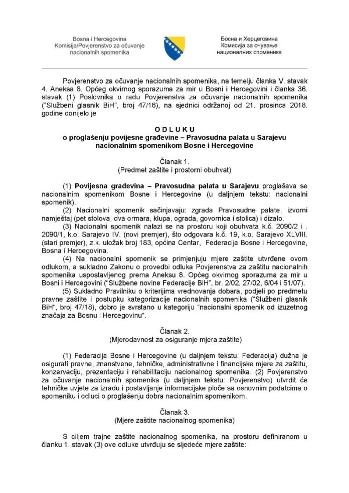 Ипак, чини се да за потврду аутентичности нећемо морати да чекамо представљање овог инвентара од стране Музеја. Наиме, Одлуком Комисије за очување националних споменика Босне и Херцеговине, број 07.3-2.3-37/18-26, од 21. децембра 2018. године (Службени гласник БиХ, број 6/19) Правосудна палата у Сарајеву, из чије је зграде Музеју Сарајева предат инвентар као онај из просторије у којој је суђено Гаврилу Принципу, проглашена је националним спомеником културе Босне и Херцеговине, а исти споменик сачињавају: „зграда Правосудне палате, изворни намјештај (пет столова, два ормара, клупа, ограда говорница и столица) и лифт“ (Чл. 1 ст. 2 Одлуке). У Образложењу Одлуке, у напомени бр. 77 која са односи на „Намјештај суда“, описан детаљно, стоји: „ Намјештај је изложен као намјештај рабљен у суђењу Гаврилу Принципу, међутим не постоје поуздани податци да ли се ради о намјештају са суђења (подв. В.Ч.), будући да се зна да је суђење Гаврилу Принципу и осталима било у дворани Војног суда гарнизона у Сарајеву. Ова просторија се налазила у склопу комплекса војних објеката-касарни ”Лагер генерала Филиповића“, касније ”Касарна Маршала Тита“. Према податцима из књиге ”130 година Кантоналног суда Сарајево“ та просторија је уништена у посљедњем рату.“