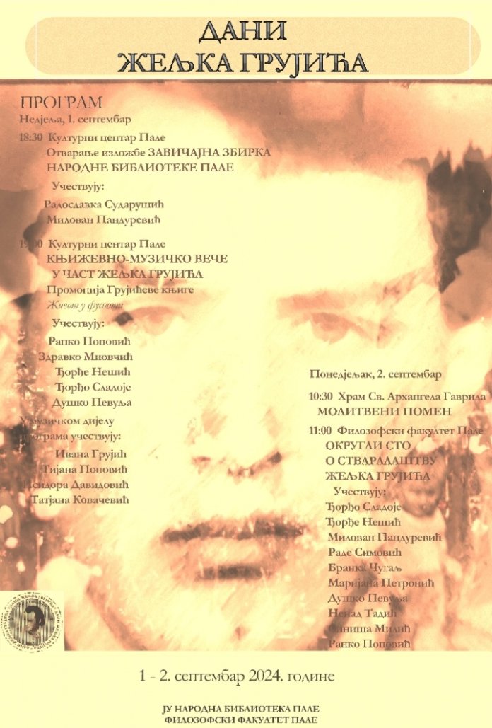 Народна библиотека Пале и Филозофски факултет Универзитета у Источном Сарајеву организоваће у недјељу и понедјељак, 1. и 2. септембра, манифестацију „Дани Жељка Грујића“ у знак сјећања на пјесника, есејисту, књижевног критичара и новинара.