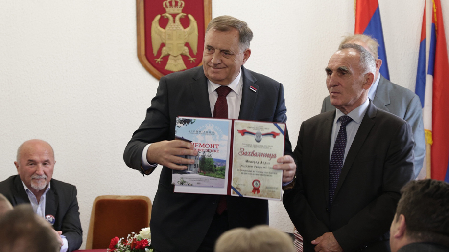 Предсједнику Милораду Додику данас је на Палама уручена захвалница за допринос у реализацији историјског пројекта – опремања Дома Републике Српске на Палама и изградњи спомен-обиљежја посвећеног ствараоцима и браниоцима Републике Српске.