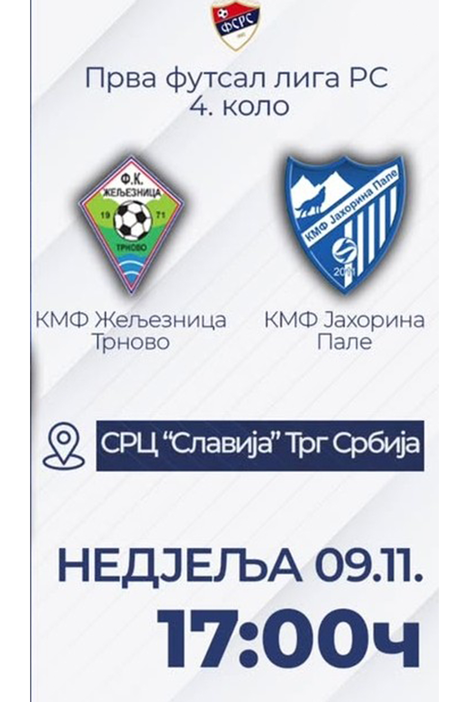 У Првој лиги футсалера Републике Српске на распореду су мечеви 4. кола, а паљански клуб „Јахорина“ снагу ће одмјерити са екипом „Жељезнице“ из Трнова.