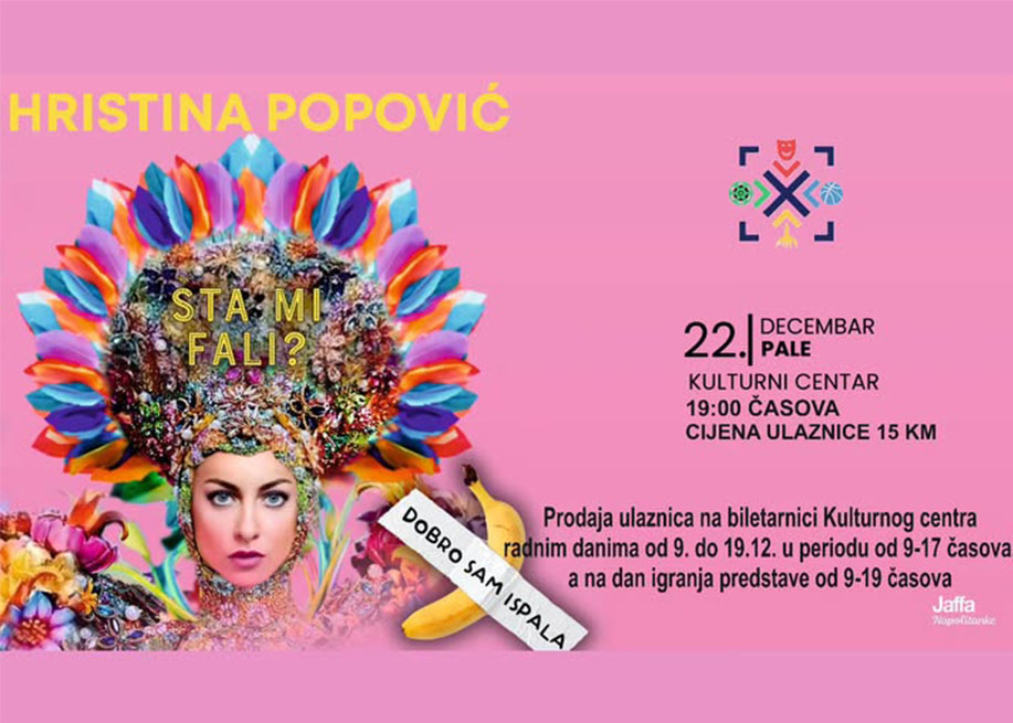 Културни центар Пале најављује гостовање популарне позоришне представе „Добро сам испала – шта ми фали“, која ће бити изведена у понедјељак, 22. децембра, са почетком у 19.00 часова, на сцени Културног центра Пале.