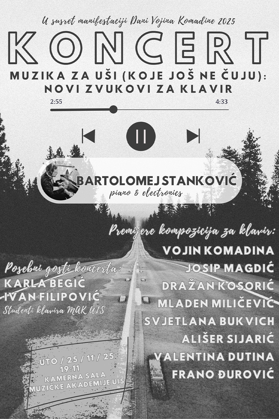 Музичка академија Универзитета у Источном Сарајеву са поносом најављује ексклузивни концерт савремене клавирске музике под називом „МУЗИКА ЗА УШИ (КОЈЕ ЈОШ НЕ ЧУЈУ): НОВИ ЗВУКОВИ ЗА КЛАВИР“. Концерт, који се одржава у сусрет манифестацији Дани Војина Комадине (децембар 2025), представља пијанист и ванредни професор Музичке академије УИС, Бартоломеј Станковић.
