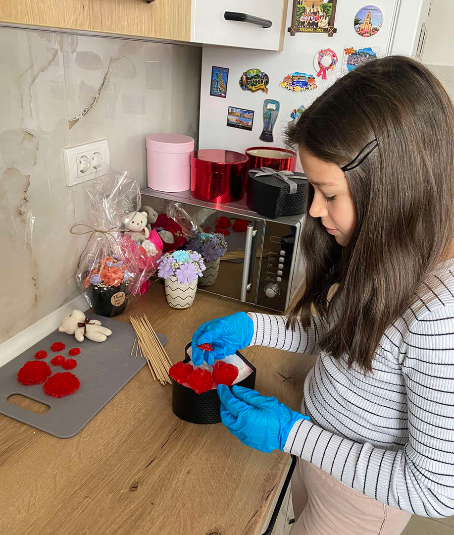 Њене још дјечије руке, али идеје зреле и маштовите, показују да креативност нема године. Мирисне аранжмане прави сама, уз много љубави и труда спаја боје, бира мирисе и пажљиво обликује сваки цвијет.