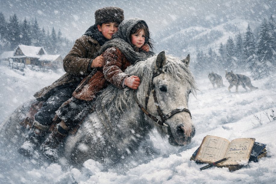 Полако су пројахали поред Вучетића гробља и посљедњих кућа, кренули су узбрдицом, па нагло избише на голу, отворену висораван, чије вртаче је јака мећава фијучући затрпавала и заравнавала огромним намјетима снијега. Дјевојчица се голим, помодрелим рукама чврсто држала за Зекину сиву сњежаву гриву, али је тешко одржавала равнотежу, јер се кобила, због све већих намјета снијега, морала пропињати. Божо је, прожет дјечачким, заштитничким нагоном вође, својим дебелим ногама чврсто опкорачио стару, мирну кобилу, десном руком лагано, уздајући је, управљао, а лијевом обгрлио дјевојчицу да не спадне са гола коњчета у дубоки снијег. У борби са студеном вјетрометином њих троје (двоје дјечице петог основне и стара сива кобила) гријали су једно друго и тешко, с муком, грабили ка првој шуми, заштитници.