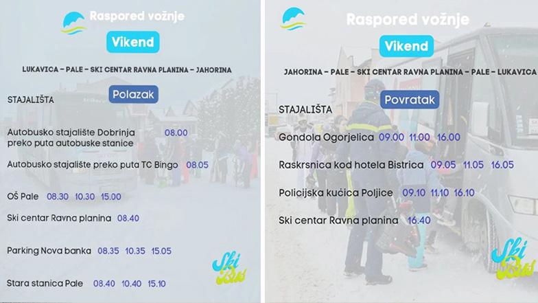 Novi raspored vožnje, objavljen na „Fejsbuk“ stranici Turističke organizacije, predvidio je da ski bus radnim danima od Pala do Jahorine vozi u tri termina, od 08.30, 10.30 i 15.00 časova.