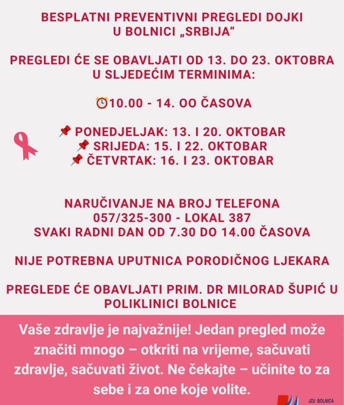 ИСТОЧНО САРАЈЕВО – У Болници „Србија“ у Источном Сарајеву од 13. до 23. октобра биће вршени бесплатни превентивни прегледи дојке поводом мјесеца борбе против карцинома дојке.