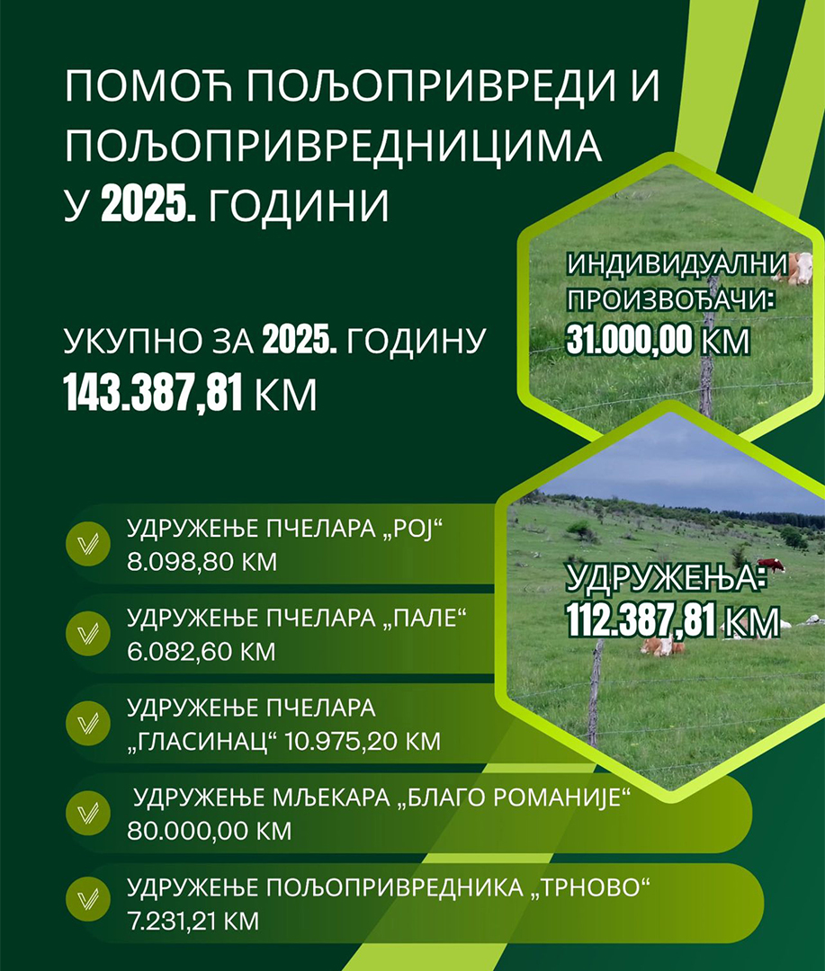 Према његовим ријечима, Удружењу пчелара „Рој“ исплаћено је 8.098 КМ, Удружењу пчелара „Пале“ 6.082 КМ, Удружењу пчелара „Гласинац“ 10.975 КМ, Удружењу мљекара „Благо Романије“ 80.000 КМ и Удружењу пољопривредника „Трново“ 7.231 КМ.