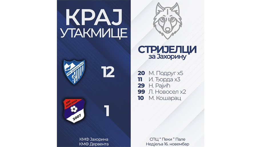 У склопу 5. кола Прве лиге Републике Српске синоћ у Палама футсалери „Јахорине“ пред око 100 гледалаца у сусрету са екипом „Дервенте“ били су голгетерски распуцани и убједљиво су славли са 12:1 (6:0).
