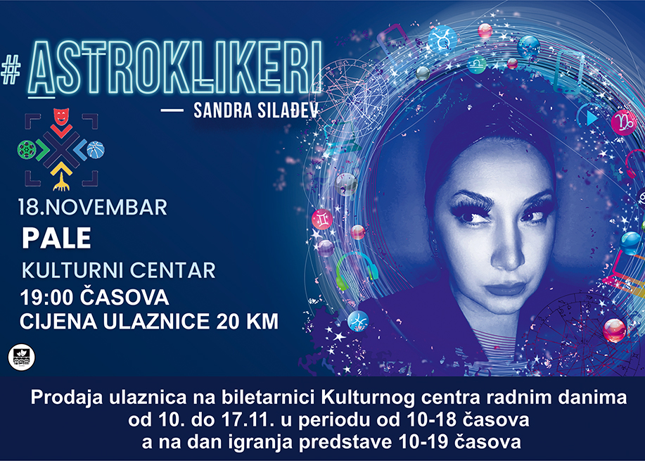 Урнебесна комедија „Астрокликери“, у извођењу познате глумице и комичарке Сандре Силађев, биће изведена 18. новембра на сцени Културног центра Пале, са почетком у 19.00 часова.