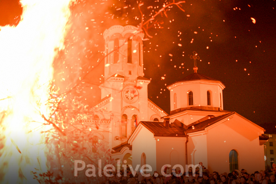 U Crkvi Uspenja Presvete Bogorodice na Palama služena je večernja služba na Badnje veče, a ispred hrama u prisustvu brojnih vjernika osveštan je i naložen badnjak.