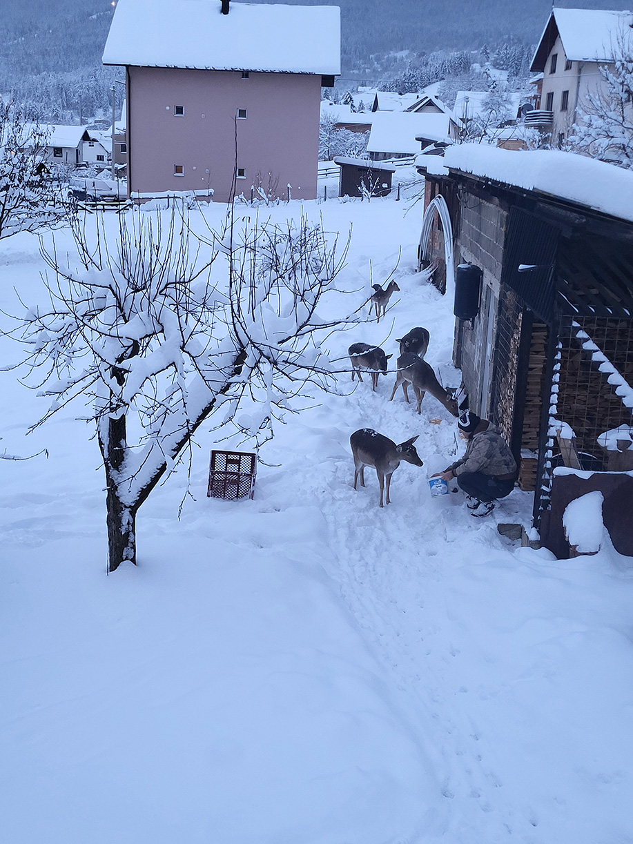 ПАЛЕ, 25. ДЕЦЕМБРА /СРНА/ – Група од четири срне и једног срндаћа јутрос је пришла човјеку на Палама и уживала у храни коју им је понудио.