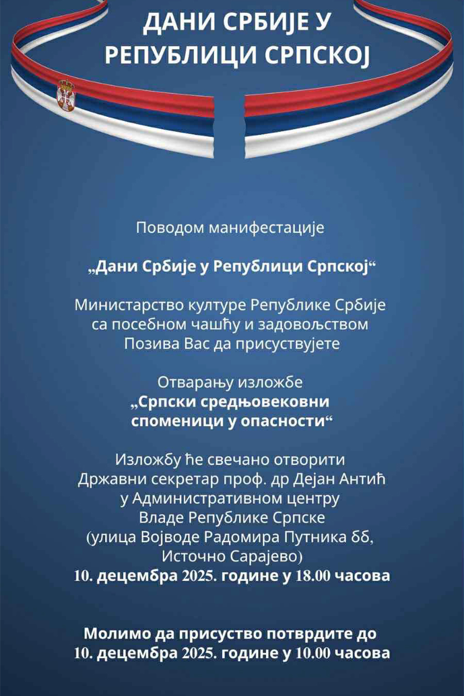 Изложба „Српски средњовековни споменици у опасности“ биће отворена у 18.00 часова у згради Административног центра Владе Републике Српске у Источном Сарајеву.