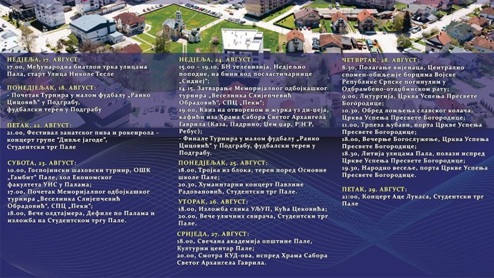 У сриједу, 27. августа, у Културном центру од 18.00 часова биће одржана свечана академија општине Пале, а смотра културно-умјетничких друштава испред Храма Сабора Светог архангела Гаврила од 20.00 часова.