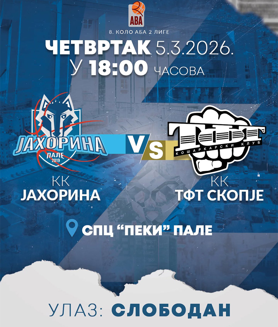 У склопу 8. кола АБА 2 лиге кошаркаши „Јахорине“ у четвртак, 5. марта у дворани „Пеки“ у 18.00 часова дочекаће екипу КК „ТФТ Скопје“ из Сјеверне Македоније.
