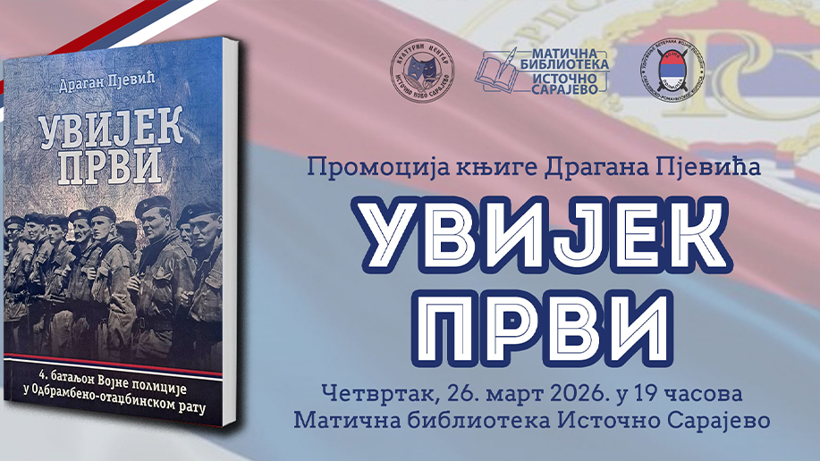 ИСТОЧНО НОВО САРАЈЕВО – У Источном Новом Сарајеву у четвртак, 26. марта биће представљена књига Драгана Пјевића „Увијек први“, која представља документарни запис о настанку Четвртог батаљона Војне полиције који је био у саставу Сарајевско-романијског корпуса ВРС.