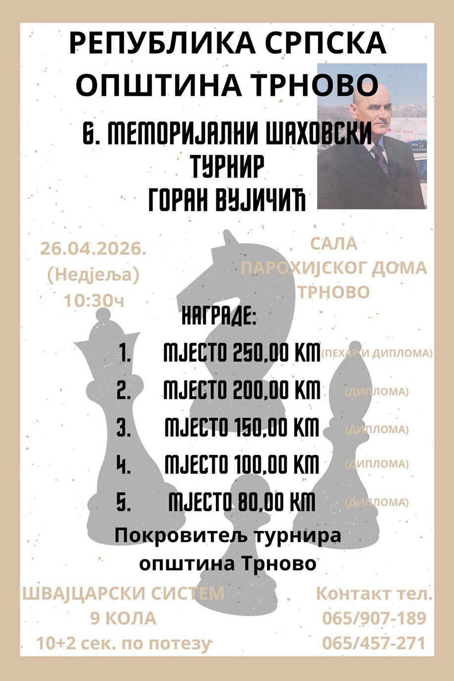 ТРНОВО – У Трнову ће у недјељу, 26. априла, бити одржан Меморијални шаховски турнир „Горан Вујичић“, у знак сјећања на некадашњег начелника ове локалне заједнице.