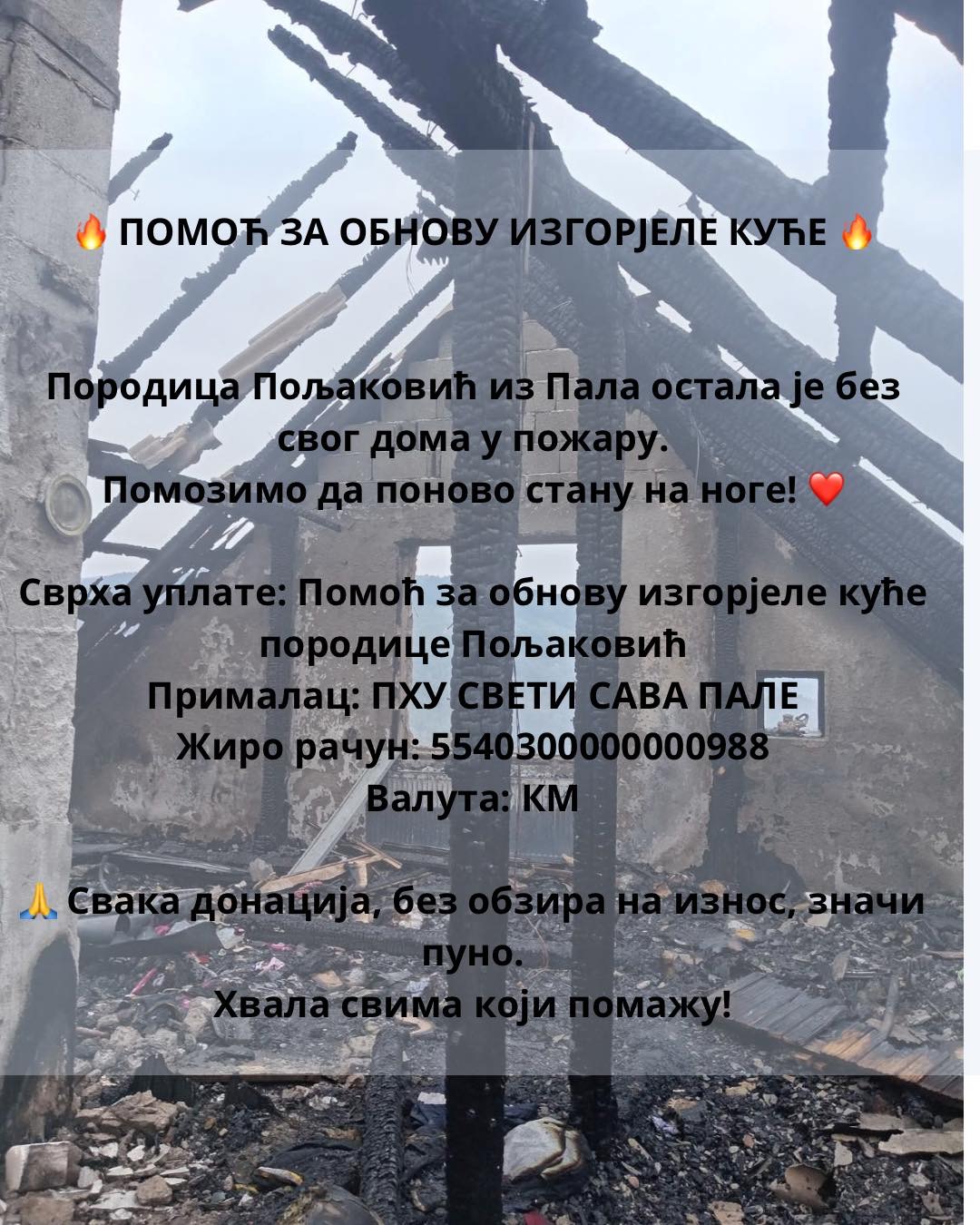 ПХУ „Свети Сава“ Пале покренуло је акцију прикупљања помоћи за породицу Пољаковић, како би им се помогло у обнови изгорјелог дома.
