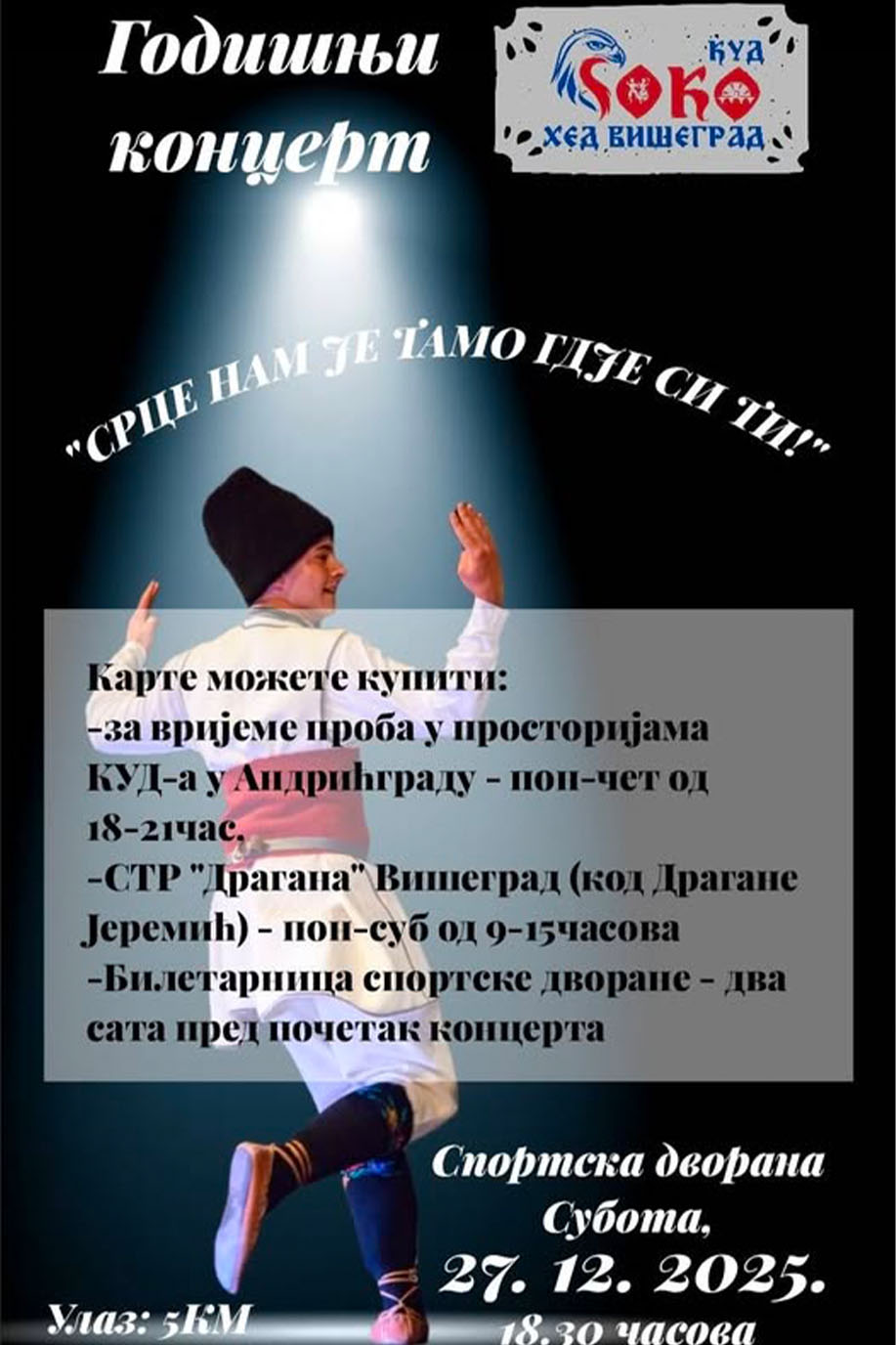 Из КУД-а „Соко ХЕД“ позивају Вишеграђане и љубитеље фолклора да присуствују концерту, уживају у богатом програму и заједно употпуне вече посвећено традицији и културном насљеђу.