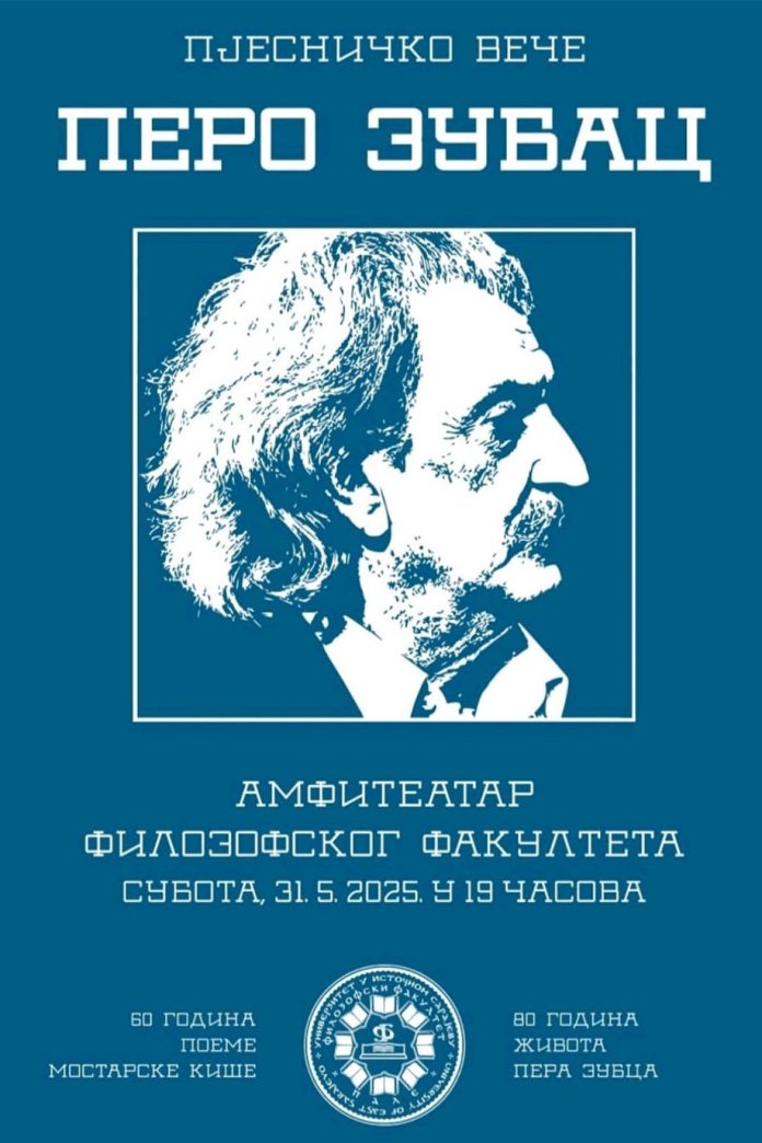 Пјесничко вече Пере Зупца биће одржано у суботу, 31. маја, на Палама поводом 80 година пјесниковог живота и 60 година од објављивања његове поеме „Мостарске кише“, најављено је из Филозофског факултета Универзитета у Источном Сарајеву, који је организатор вечери.
