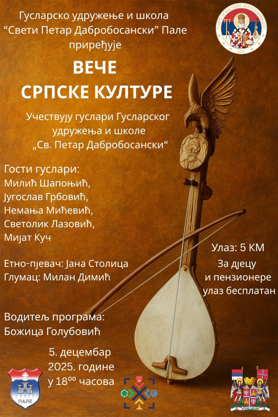 Гусларско удружење и школа „Свети Петар Дабробосански“ са Пала организоваће вечерас вече српске културе с циљем промоције епског стваралаштва и српске културне баштине.