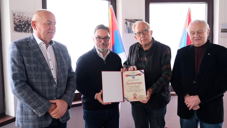 Асоцијација „Ствараоци Републике Српске“ данас је уручила захвалницу замјенику предсједавајуће Савјета министара Сташи Кошарцу за подршку и помоћ изградњи и отварању спомен-обиљежја Ствараоцима и браниоцима Републике Српске у комплексу Малог дома на Палама.